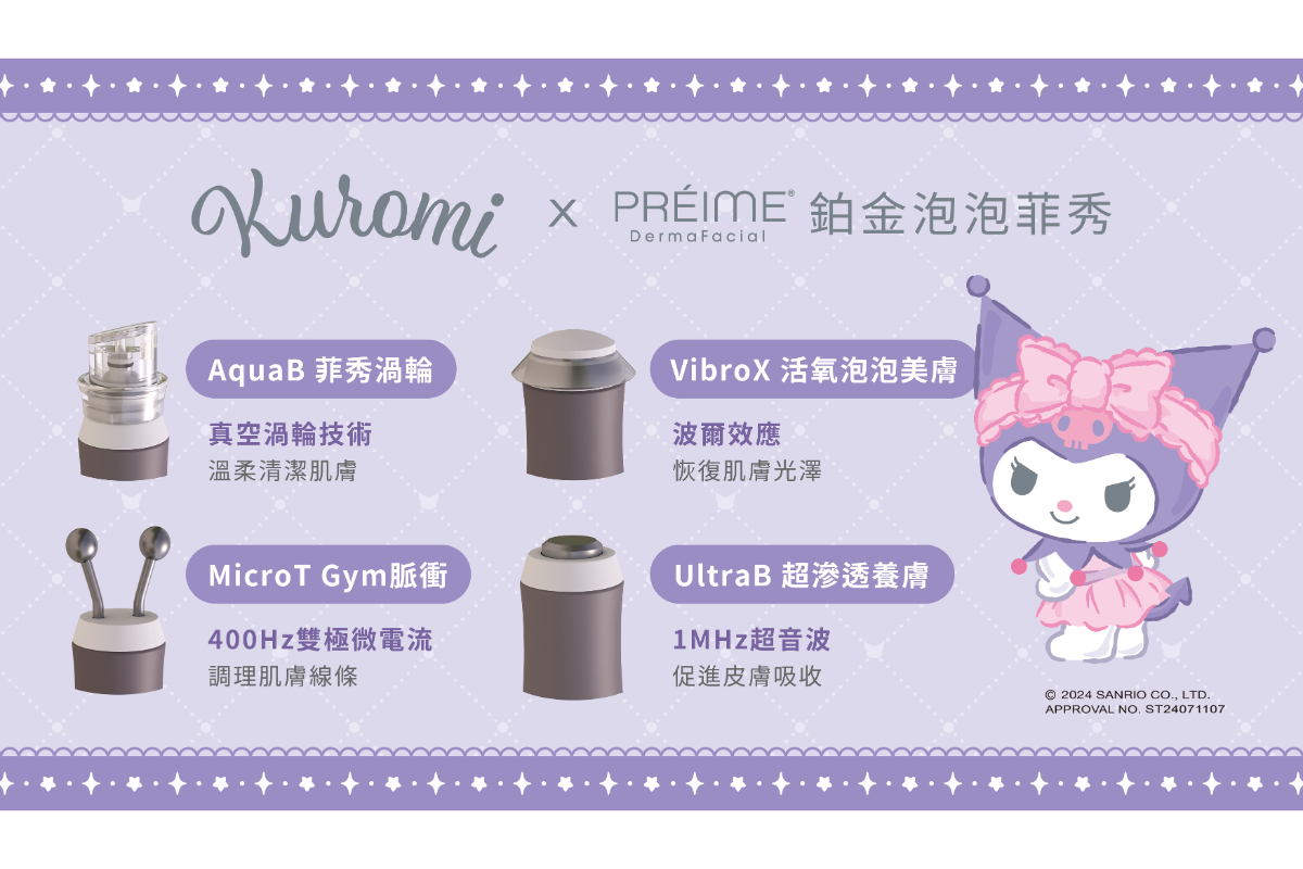 Préime DermaFacial 鉑金泡泡菲秀擁有四大科技的手握把:AquaB 菲秀渦輪、VibroX 活氧泡泡美膚、MicroT Gym 脈衝、UltraB 超滲透養膚,突破傳統肌膚管理僅能做到的表層保養,創新設計達到修護不同層級的肌膚問題,由內而外延緩老化,以「淨、活、運、養」四步療程,重建健康肌理,鎖住青春輪廓!