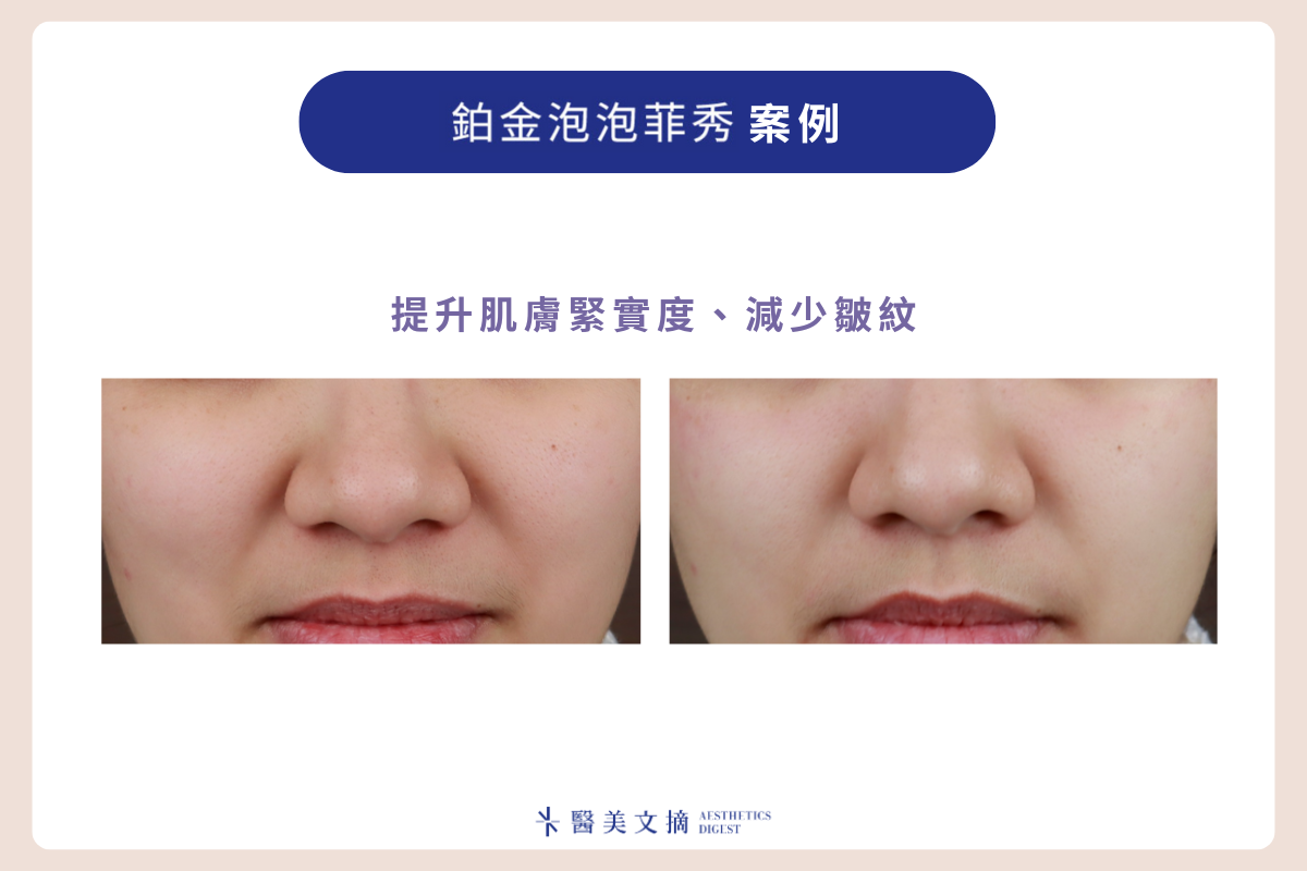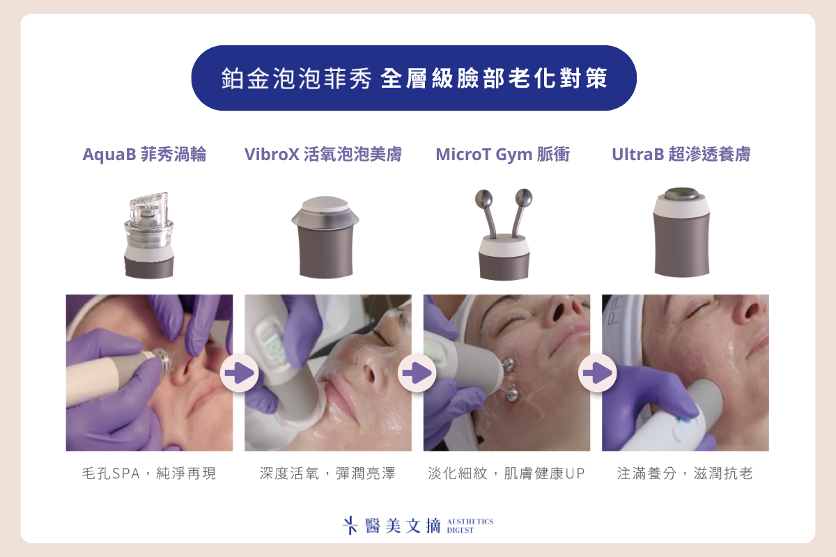 若要進一步解決表層到深層的臉部老化問題,鉑金泡泡菲秀也常被建議與電音波、雷射、針劑等進階療程結合,發揮「打底+加乘」的效果,既能延緩老化、也能讓後續的醫美療程更事半功倍,可以說是更進階的全層次抗老選擇,讓青春感從肌膚深處被重新喚醒!
