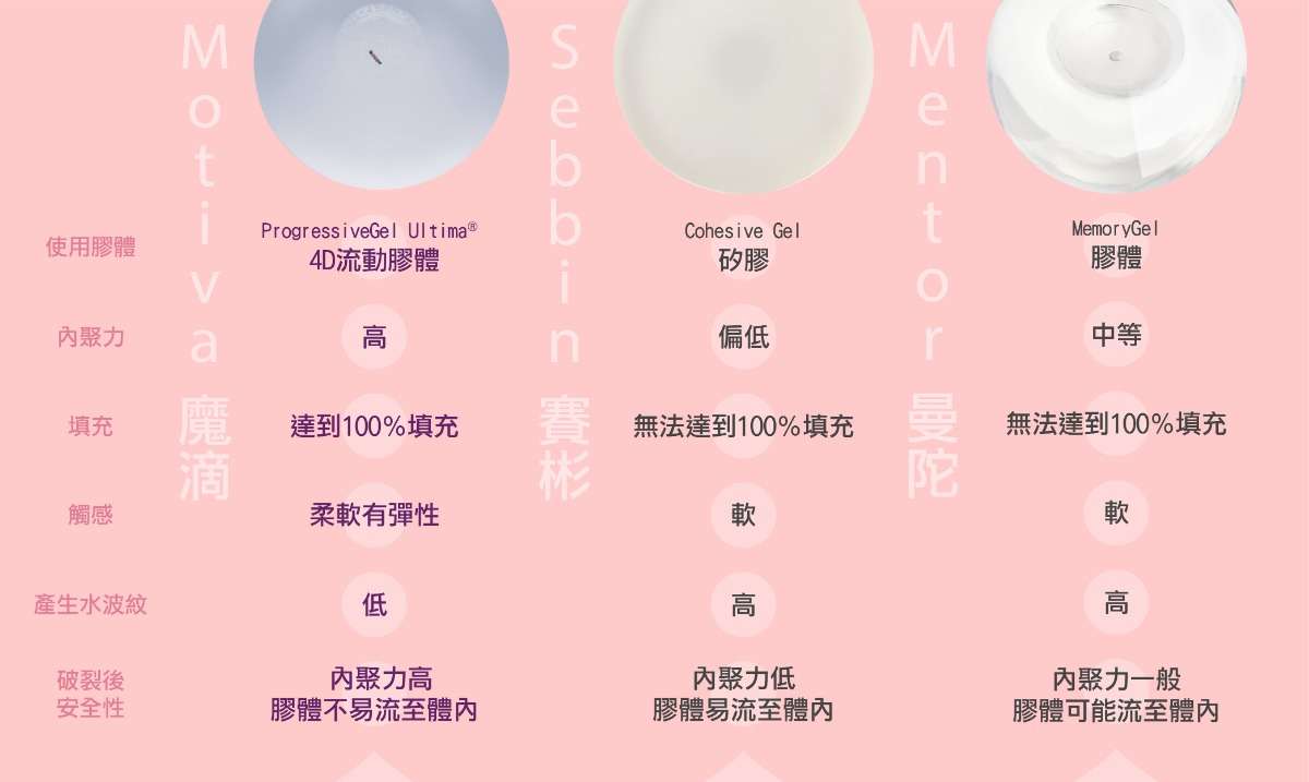 強調安全性的Motiva魔滴®使用4D流動膠體,具有內聚力高的優勢,即使不幸破裂,膠體也不會流竄在體內(加上BluSeal®視覺辨識防護膜阻隔,雙倍保護),而且Motiva魔滴®的膠體皆是100%填充,比起他牌假體更不容易產生水波紋。