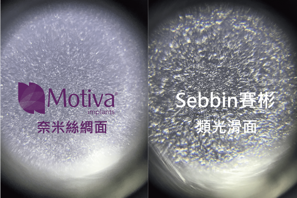 至於新的植入物出現,雖然希望模仿成奈米絲綢面,可以在安全性以及觸感取得平衡,因此在外膜設計更加細緻的顆粒,但使用顯微鏡觀察發現,相比於Motiva魔滴®,顆粒感稍大、分布不均,破裂率更是高達10%以上。